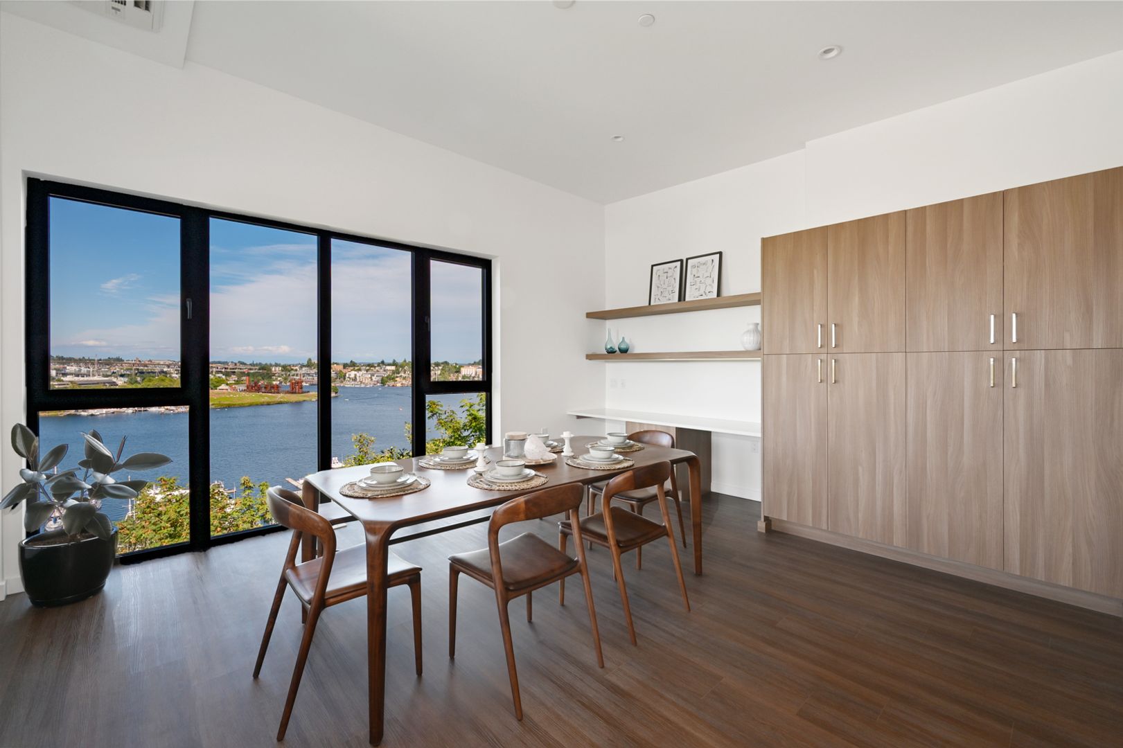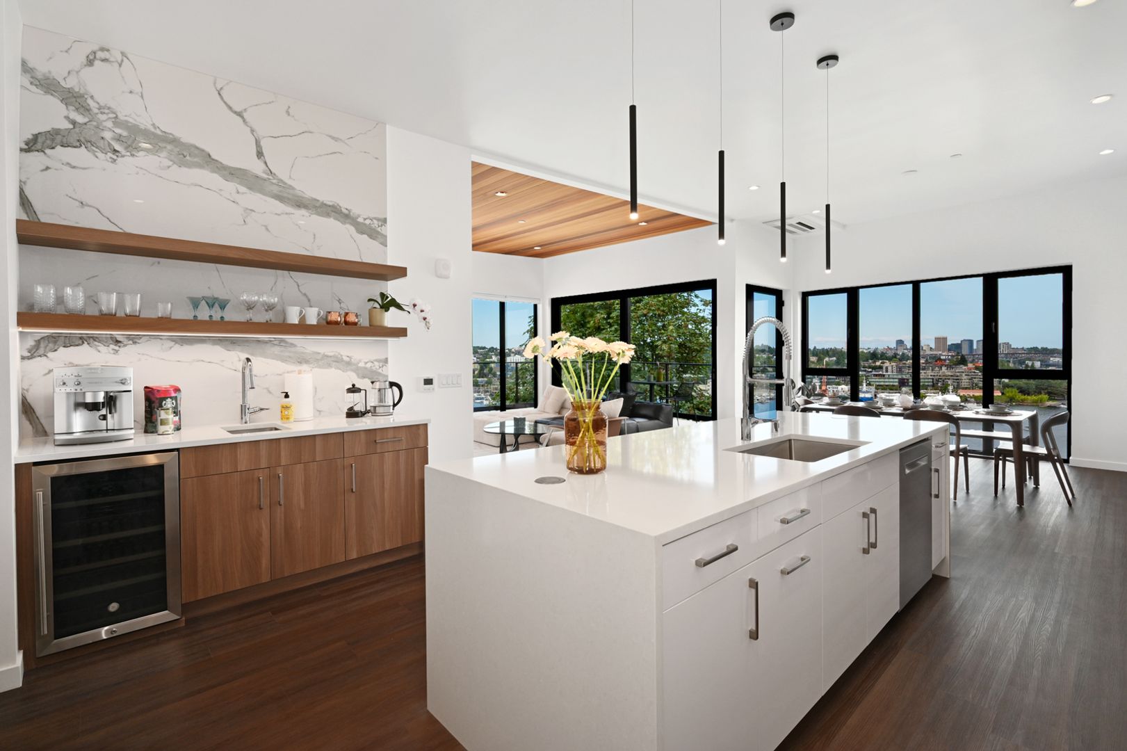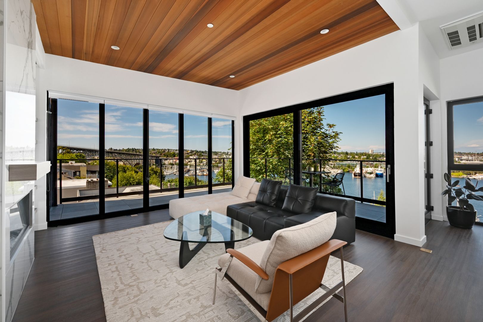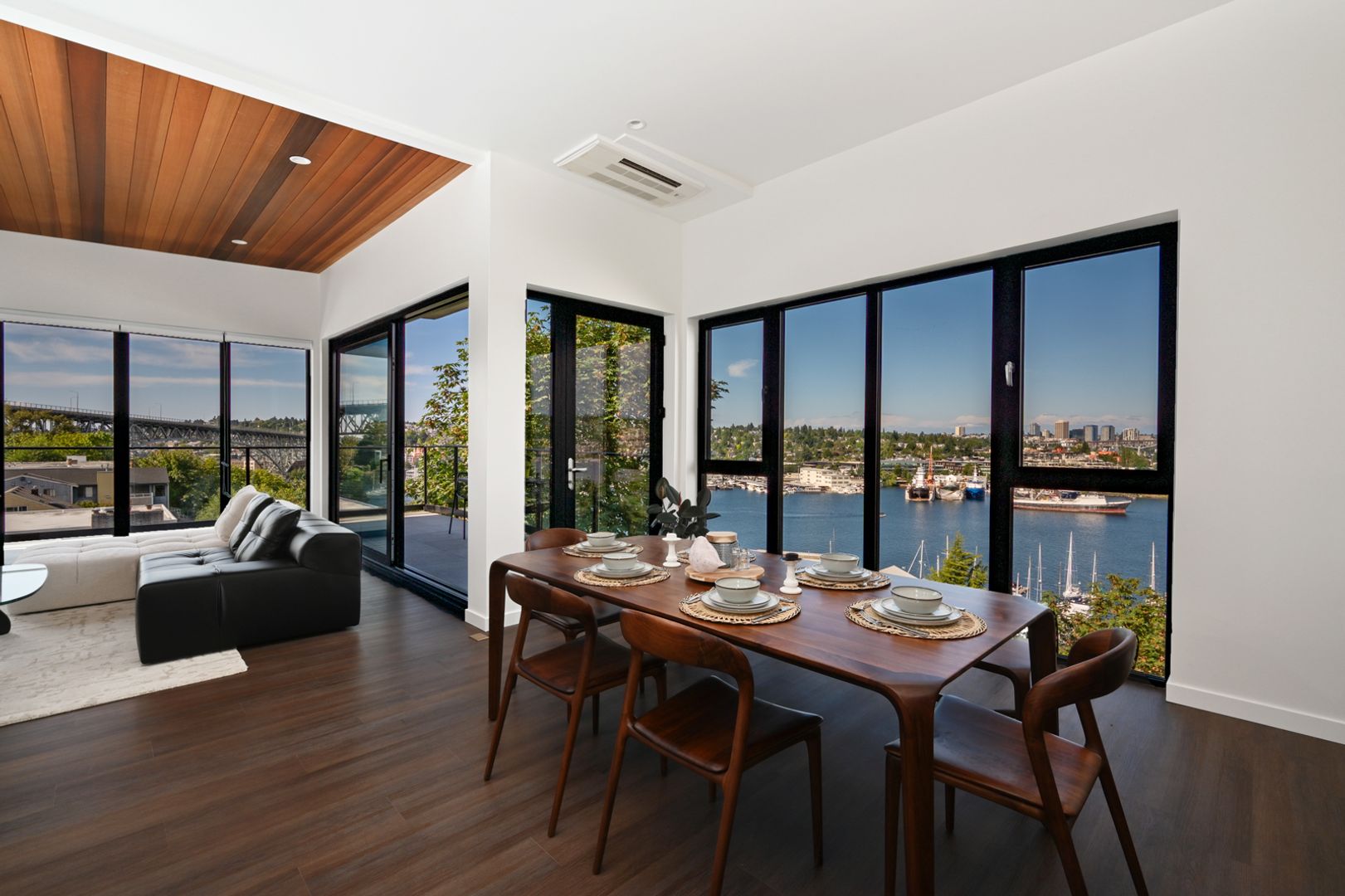 Introducing an almost brandnew fully furnished turn-key top floor luxury 3BR/2.5BA Condo with stunning views of Lake Union, Gasworks Park, mountains, and bridges. This spacious top floor 3BR/2.5BA unit boasts 1,836 SF of refined living space and is conveniently located in the heart of the city only minutes from Fremont, Westlake, South Lake Union, and Queen Anne. Easy access to restaurants, cafes, shopping, public transportation, Hwy 99 & I-5. This unit offers the perfect blend of luxury and convenience for your urban lifestyle. Stay comfortable year-round with energy-efficient heating and cooling mini split units in each zone. Energy efficient European manufactured Zola floor-to-ceiling sliding doors and windows let in lots of natural light. The covered wrap-around deck is perfect for relaxing, BBQ, and enjoying the breathtaking vistas. The chef’s kitchen’s upscale Bosch stainless steel top of the line appliances including a 5-burner gas stove, beautiful cabinets, large island, and gorgeous countertops make cooking a joy. The built-in desk adjacent to the dining room is perfect for a home office. The bar area features additional cabinets, an under-counter wine fridge, and a second sink. The luxurious master suite with deck access can accommodate a king size bed. The adjacent master bath features Grohe fixtures, two sinks, walk-in shower, and beautiful tile work. Spacious laundry room with high-capacity front loading washer/dryer, cabinets, and folding area. Two additional bedrooms, full bath, and a powder room feature the same high-end fixtures and tile work. Custom lighting, color, and fixtures throughout. This condo also includes storage in a secured covered garage as well as a community bike storage rack. Easy access to the buildings interior via secure elevator. Building is ADA Certified and includes one Parking Space with individual EV Charging Station. Fully Furnished Turn-Key Unit includes Linens, Bedding, Dish & Cookware. Professional Cleaning Service Available for an additional Charge.