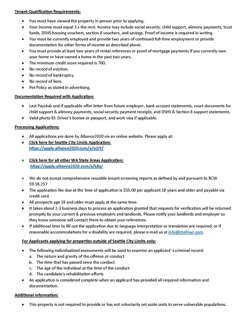 Terms: 1st & 1-month security deposit minus non-refundable fees.